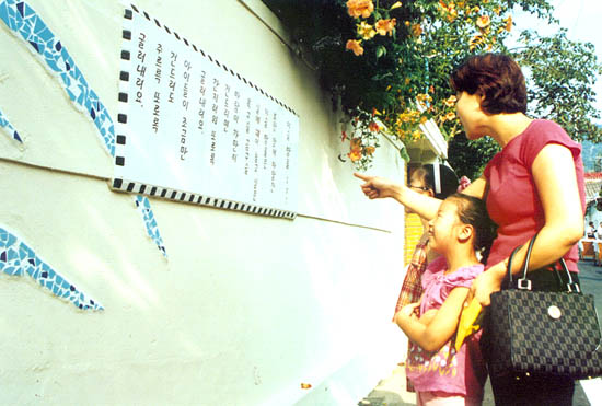 물론 처음부터 그랬던 것은 아니다. 시화마을이 조성된 광주 북구 문화동은 호남고속도로 동광주 나들목이 있는 광주의 외곽지역이다. 4000여가구가 살고 있는 문화동의 구성 대부분은 이 일대에 우후죽순 식으로 들어선 임대 아파트 주민 또는 기초생활수급권자다. 그러다 보니 일반 아파트의 중산층과 임대 아파트를 중심으로 한 저소득층 사이의 계층 간 벽이 두터웠다. 말은 '방음벽'이었지만 높은데다 험상궂은 회색 구조물은 '냉랭한 거리감'을 상징했다. 2000년 주민 25명으로 발족된 주민자치위원회는 쓰레기 투기장을 공동의 공간인 쌈지 공원으로 바꾸는 작업을 시작했다. 2002년부터 시화마을의 시작점인 '시화(詩畵·시와 그림)마을'프로젝트를 시작했다.