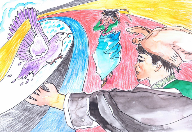 문도령이 옥항에 올라온 걸 어떵사 알아신디 궁안에선 냑 먹으레 오렌 초청을 엿다. 청비가 꿰를 내연 서방 가심더레 소게 뭉텡일 담아주멍,