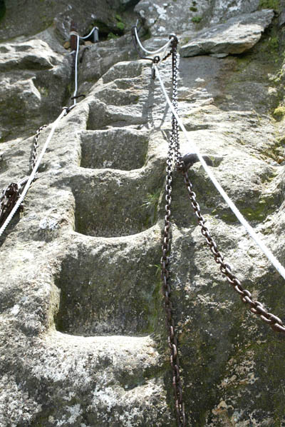 서북벽은 조면암으로 이뤄진 바위덩어리가 급경사를 이룬 곳인데 50년대 후반 당시 산에 다니던 산악인들이 이곳에 등산루트를 개척한 것이다. 이와 관련해 부종휴와 김종철이 징과 망치를 이용해 삼일동안 파서 발을 디딜 수 있도록 계단을 만들었다는 전설적인 이야기와 더불어 현임종이 백록담에 갈 때마다 나대를 이용해 홈을 판 것이라는 주장도 있다.