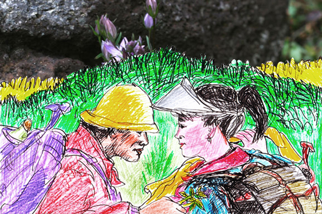 그 소리가 유난히 컷던지, 훽하고 돌리는 얼굴광 정멘으로 마주치자 서로 양지가 벌겅여진다. 얼핏 대낫에 민으로 본 양지가 꼭 푸치니의 오페라 ‘마농레스코’에 나오는 여주인공을 닮앗다. 김선셍의 가심 속에서 ‘어떠불라’ 어떤 기운이 솟는다. 젊은 시절에 봣던 마농레스코의 강렬 인상에서도 그런 느낌이엇덴 생각이 든다. 그걸 떠올리멍 걷는디, 갑자기 울럿이 산 돌아보는 아주망의 양지광 함마여시문 부닥칠 뻔 엿다. 순간 훅 마농 내우살이 나는 것 으멍, 정신이 바짝 들엇다.