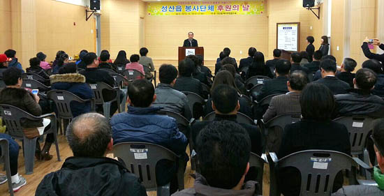 성산읍복지위원협의체(위원장 김한영)는 18일 오후 5시 성산국민체육센터에서 후원사 등 성산 지역 봉사단체장과 수혜자 등 100여명이 참가한 가운데 후원사와 수혜자간의 '만남의 날' 행사를 열고 장학금과 난방유 등 생필품을 전달했다.