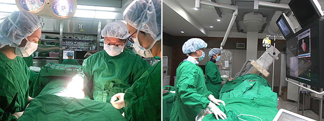 ▲ 유방암 수술하는 모습(사진 왼쪽), 경피적 관상동맥 중재술을 하고 있는 모습(오른쪽).