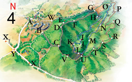목재데크를 10분 내려가면 갈림길(〃G)이다. 좌회전하면 탐방로 출구(〃W)로 이어지며 정상코스(1.8㎞·1시간 소요)가 종료된다. 직진하면 수직동굴(〃O)을 거쳐 나머지 8개 봉우리를 모두 돌아가는 능선코스(5km·2시간 소요)다.