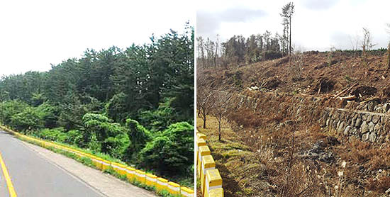 울창한 소나무 군락지였던 제주시 용강동 봉아로 심수천 서쪽 언덕(사진 위) 약 9000㎡가 재선충으로 인해 고사목 제거작업이 진행되면서 완전히 벌거벗은 '민둥산'으로 전락하고 말았다. 김철웅 기자