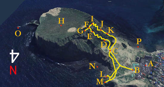정상부(〃F)로 들어서면 완전히 딴 세상이다. 가파른 외벽을 따라 설치된 돌계단을 올라왔어야 했는데 정상부 안쪽 분화구(〃H)에는 평평한 풀밭이 펼쳐져 있다. 대형 원형경기장을 방불케 한다. 분화구 직경이 대략 600m이고 최고점과의 표고차가 80여 m다.