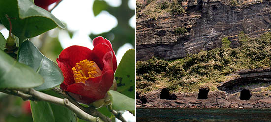 ▲ 탐방로에 핀 동백(사진 왼쪽) 성산일출봉 서면의 진지동굴(오른쪽).