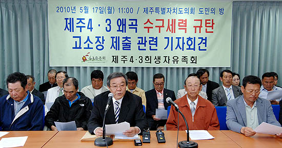 ▲ 4·3유족회가 2010년 5월 17일 도민의 방에서 수구세력들이 제기한 4·3관련 헌법소원 청구인 대부분이 허위로 기재됐다며 기자회견을 갖고 있다. 사진=자료사진