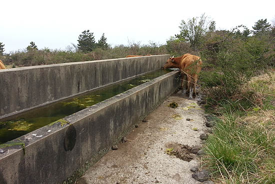 ▲ 소가 숲속에 설치된 수도관을 타고 내려온 '언물'을 마시고 있는 모습.