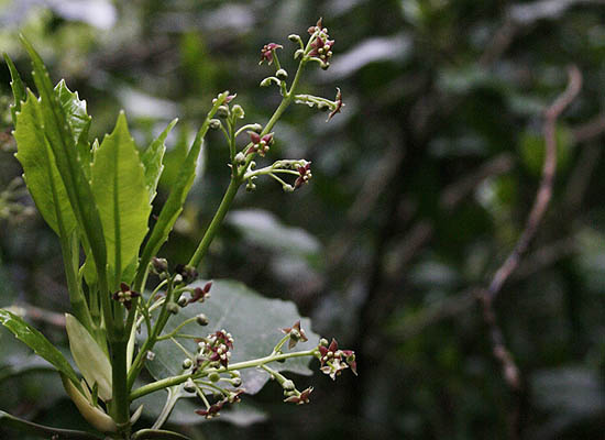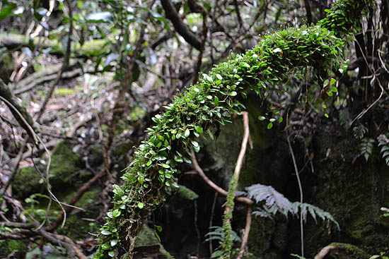 깊고 따뜻한 곶자왈에서만 볼 수 있는 식나무가 작고 보잘 것 없어 보이는 꽃을 피우고 봄맞이를 하고 있다. 줄기 곳곳에서 뿌리가 돋아나는 것을 보니 이처럼 음습한 곳에서는 차라리 발 뻗어 뿌리내리는 것이 훨씬 개체를 늘리는데 좋을 듯도 하지만 굳이 꽃을 피우며 유전자 다양성을 확보하려는 노력이 착하다.