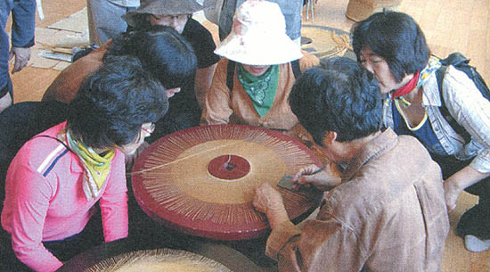 ② 원형의 나무판인 양태판에 쌀 엮음을 빙 둘러 놓는다.