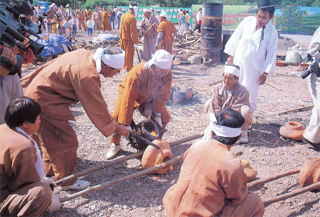 | 불미공예는 규모에 따라 '손풀무'와 '골풀무' 등으로 구분됐다. 손풀무는 손으로 일으키는 바람으로 쇠를 녹이거나 달구는 방법이다. 골풀무는 골에 맞는 널빤지를 걸치고 한쪽에 세 사람씩 서서 널뛰기하며 바람을일으킨다. 이 바람은 용광로로 흘러들어가 불길을 타오르게 해 쇳물을 끓여낸다. 이쇳물을 오시장태 라는 용기에 덜어서 틀에 부어 식히면 완성품이 만들어진다. 특히 덕수리의 불미공예는 원대장 1명, 알대장 1명, 젯대장 3명, 둑대장 1명, 질먹대장 1명, 불미대상 6명, 일꾼 4명, 솥메는 대장 6명 등 24명으로 구성됐다.이렇듯 불미공예는 각자 가지고 있는 기능을 대장의 지시에 따라 움직이는 공동체 협력이 필요했다. |