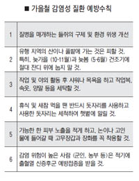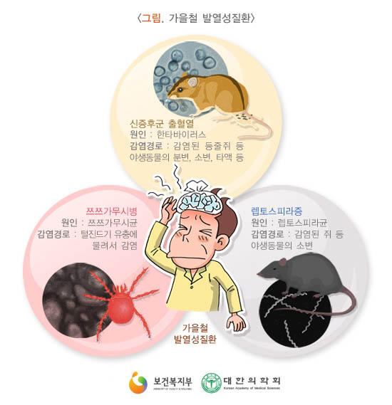 국내에서 흔히 발생하는 가을철 감염성 질환은 쯔쯔가무시병, 출혈열 신증후군, 렙토스피라병이다. 이 질환들은 매년 우리나라에서 발생하며 초기 증상이 특징적이지 않아 조기 진단이 어려울 때가 많으며, 적절한 치료를 받지 않는 경우 드물게 심각한 합병증이 초래되거나 생명을 잃을 수 있다.