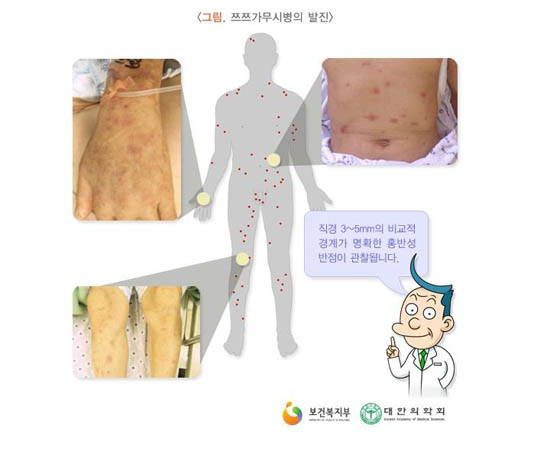 우리나라의 경우 전국에 걸쳐 발생하고 있으며, 남자에 비해 여자에게 많이 발생한다. 이는 농촌에서 남자들은 주로 서서 하는 작업이 많은데 반해 여자들은 쪼그리고 앉아 작업하는 일이 많아 진드기에 노출 기회가 많은 것과 같은 생활 습관 등의 이유일 것으로 생각된다.