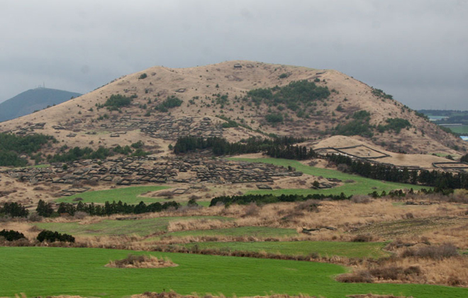 당오름 앞 무덤들. 매장풍속이 뿌리내리면서 제주 특유의 묘지 형태가 이루어졌다.