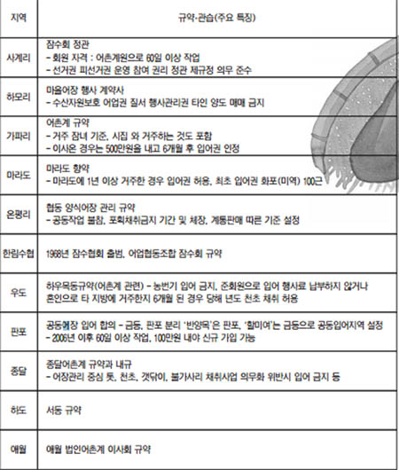 바다어장과 관련해 공동어장의 관리나 입어권(자격) 채취규정, 금 또는 해금(허채), 벌금에 대한 구체적인 내용들로 자연스럽게 공동체 운영에서 중요한 역할을 했다.