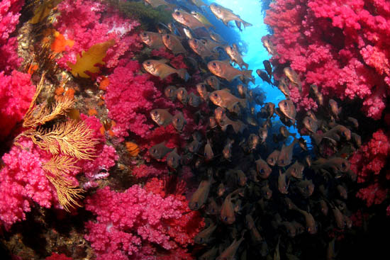 그러한 해류의 영향으로 드러난 제주바다의 대표적인 사례가 바로 연산호이다. 연산호는 적도부근에도 있고, 제주바다보다 위도가 더 높은 대마도에도 있지만 세계적으로 종수가 다양하고 큰 군락을 이룬 곳이 바로 제주도이며 특히 서귀포바다 문섬을 중심으로 그 일대의 섬과 연안에 집중 분포되어 있다. 그러니까 세계적으로 연산호가 서식할 수 있는 최적의 환경이 바로 서귀포바다인 셈이다.