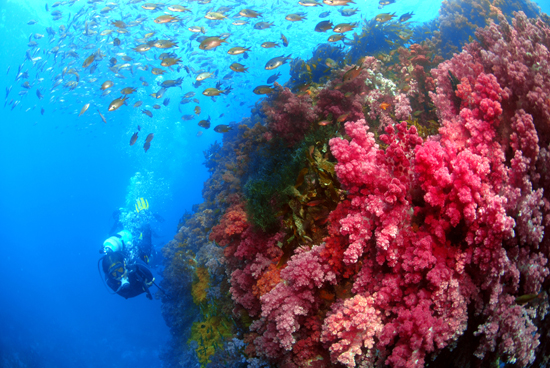제주바다는 꽃들이 만들어낸 동산이 무수히 산재해 있다. 꽃동산은 해수욕장에서 물안경으로 관찰할 수 있는 수심대가 아닌 스쿠버다이빙으로 조금 더 깊이 들어가야 관찰할 수 있다. 스쿠버장비를 차려 입고 입수를 시작하면 발목이 잠기는 곳부터 바다의 식물 해조가 휘휘 늘어진 숲을 지나게 되고, 수심 10m를 넘어서면 온갖 빛깔을 화려하게 발산하는 산호층이 시작된다.