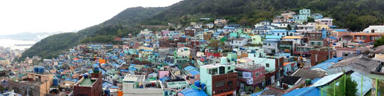 감천문화마을은 높은 산비탈에 곡선형으로 조성돼 마을이 한눈에 보이고, 항구과 바다가 내려다보이는 전경을 갖고 있다.