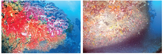 제주바다 속에는 병풍처럼 펼쳐진 주 상절리절벽과 해저에서 솟구친 암반을온통 뒤덮은 연산호가 저마다 화려한 색감을 품어내며 또 다른 다양한 산호 류와 다양한 형상으로 어울려 꽃동산을 이루고 있다.