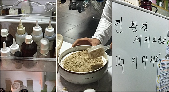 실제 윤 대표가 사용하는 방법이기도 하다. 얼룩의 특성에 따라 배합하는 재료를 바꿔준다. 의뢰가 들어오면 세탁물 특성에 따라 즉석에서 세제를 배합해 쓴다. 한 켠에 세제로 쓸 약초를 계속해 달이는 모습도 여느 세탁소에서는 볼 수 없는 모습이다. 냉장고도 천연 재료 보관용으로 변한지 오래고, 재료별로 습기며 온도 관리까지 애지중지다.