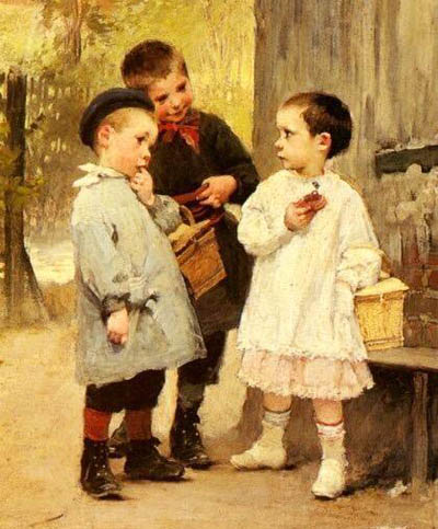 프랑스 화가 장 조프루아(1853~1924)의 그림이다. 장 조프루아는 프랑스를 대표하는 가장 대중적으로 잘 알려진 화가 중 한사람이다. 그가 그린 그림 중에는 '꿈을 쫓는 아이들' '선생님, 고맙습니다' '수학문제', '혁명일의 아이들' '금붕어를 든 어린이들' '싫어도 이야기를 들어야하는 아이들' '벌 받는 중' '개에게 밥 주는 아이' 등 주로 아이들과 관련한 이야기를 그림으로 그렸다. 그가 그린 그림들 속 아이들은 하나같이 천진난만하고 순수한 미소와 솔직한 마음들을 표현하고 있다.