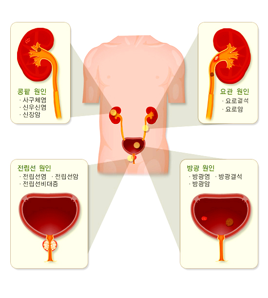 혈뇨는 소변이 최초 만들어지는 신장에서부터 몸 밖으로 배출되기 직전인 요도까지 소변이 지나가는 요로계의 어디에서든지 문제가 있을 때 나타날 수 있다.