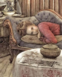 희고 재빠른 손가락이 끈과 포장지를 풀었다. 그러자 기뻐 어쩔 줄 모르는 환성이 터져 나왔다. 뒤미처, 가엾게도 갑자기 여성의 발작적인 울음이 터져 방안은 눈물 바다로 변했다. 그래서 이 방의 주인은 있는 힘을 다해서 아내를 위로하여야 했다.