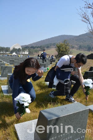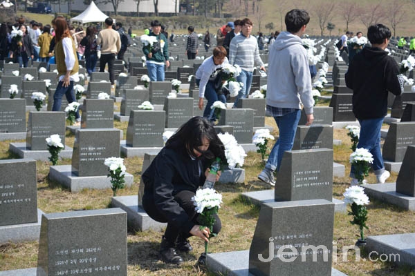 위령제단에 헌화·묵념하고 행방불명인 표석에 조화를 꽂으며 말을 아낀 가운데 표석 3800여기가 있는 공간은 금세 학생들의 하얀 조화로 채워졌다.