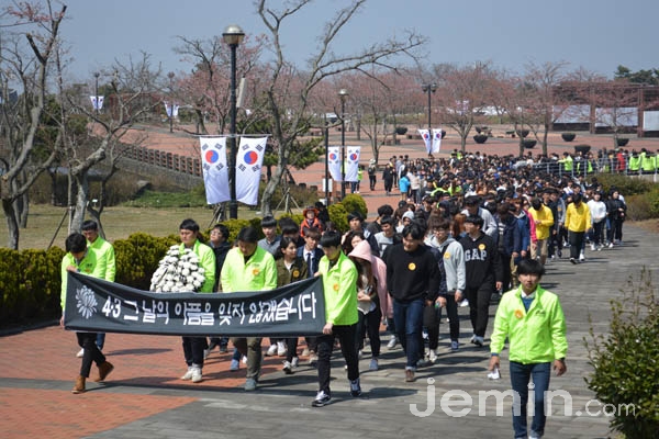 지난달 26일 거리 시가행진에 이은 4·3행보는 이날 재학생 500여명이 참가한 가운데 유적지 순례와 평화공원 방문으로 이어졌다. 매년 진행되는 행사지만 올해 행사는 어두운 4·3을 밝은 분위기로 이끌려는 시도로 눈길을 끌었다.