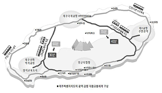 제주도가 국토연구원에 의뢰해 지난 2월 제출받은 제주미래비전 본보고서에는 광역급행 대중교통체계 구축과 도 전역 대중교통 연계 및 환승체계 구축 등을 대안으로 제시했다.