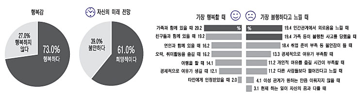 반대로 '관계'로 인한 상실감도 크게 느꼈다. '불행하다'는 느낌에 대해 19.4%가 '가족·친구·학교·일터 등 인간관계에서의 외로움'을 꼽았다. 이는 '가족이나 지인들이 불행한 사고를 당했을 때'(19.4%)의 감정과 비슷했고 '취업 준비 부족 또는 취업 불투명 등 불안감'(18.4%)에 앞섰다.