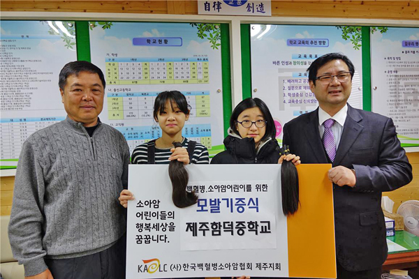 함덕중학교(교장 홍순열) 부연경(2학년·사진 오른쪽)·강미소(1학년) 학생은 백혈병 소아암 어린이들을 돕기 위해 머리카락을 ㈔한국백혈병소아암협회 제주지회에 기부했다.
