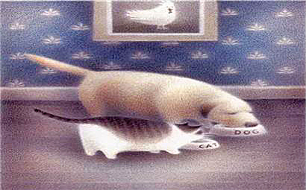 피터 매카티가 그린 「누렁이랑 야옹이」 속에는 우리가 흔히 만나는 개와 고양이가 등장한다. 그리고 개와 고양이가 흔히 하는 행동들이 평범하게 그려진다. 창가를 좋아하는 야옹이는 창가에서 잠을 자고, 마룻바닥을 좋아하는 누렁이는 바닥에서 잠을 잔다. 모험을 좋아하는 누렁이가 산책길에서 만난 검둥이와 바닷가를 누비며 뛰노는 사이, 야옹이는 집에서 휴지를 풀며 혼자 놀고 있다. 누렁이가 집에 돌아오고, 누렁이와 야옹이는 사이좋게 같이 밥을 먹는다. 그리고 각자가 좋아하는 잠자리로 가 잠을 잔다.