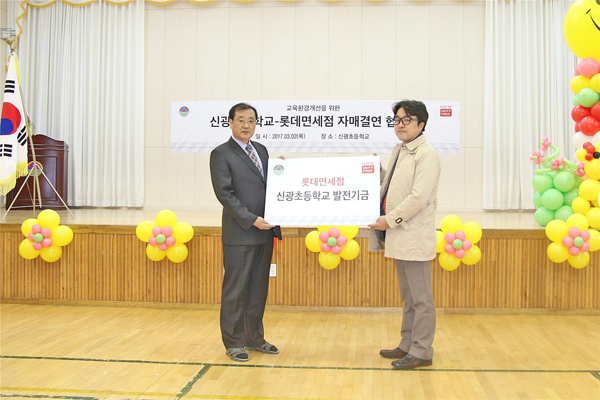 롯데면세점 제주㈜는 2일 신광초(교장 박종익) 입학식 및 개학식에서 교육자재·도서 구입, 야구부 운영 지원을 위한 학교발전기금 5000만원을 전달했다. 이날 전달된 기금은 지난 2015년 12월 롯데면세점 제주㈜와 신광초가 자매결연을 체결하면서 조성됐다.