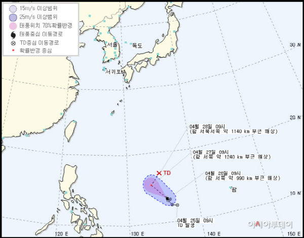 태풍센터는 28일 오전 괌 서북서쪽 약 1140㎞ 부근 해상에서 서서히 열대저압부로 약해진 후 소멸할 것으로 전망했다.