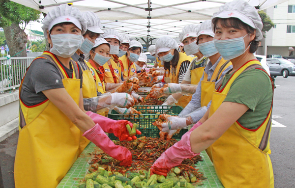 대한적십자사봉사회 제주시지구협의회(회장 김종빈)는 22일 제주적십자사 앞마당에서 봉사원 100여명이 참가한 가운데 희망풍차 결연가구를 위한 오이소박이 나눔행사를 진행했다.