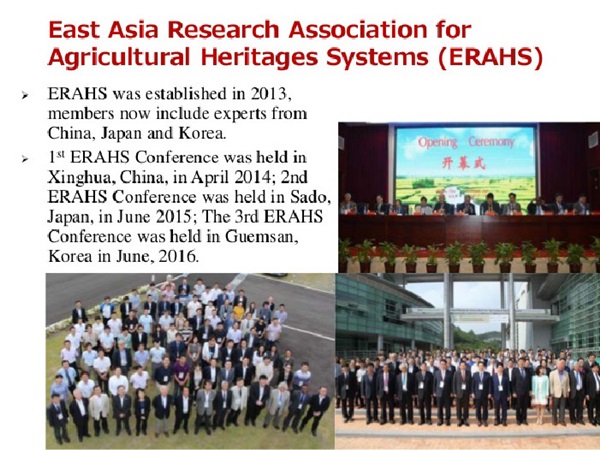 한편 동아시아 농업 유산 학회(ERAHS)는 2013 년부터 일본, 중국, 한국의 3개국에서 매년 돌아가면서 개최하고 있다. 순수 학술대회에서 최근에는 각국의 GIAHS 사이트, NIAHS(국가 수준의 농업 유산) 사이트 간의 교류가 중요한 위치를 차지하고 있다.