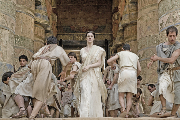 영화에서 히파티아(레이첼 웨이즈 분)는 미모와 지성을 겸비한 천재 천문학자로 나온다. 그녀는 로마제국의 최후를 맞는 격변의 소용돌이 속에서도 "나는 진리와 결혼했다"할 정도로 학문에 몰두한다. 자신을 연모하는 제자의 구애에 생리혈이 묻은 천을 보여주며 거절할 정도였다. 서기 391년 당시 알렉산드리아에는 이교도, 유대교, 기독교가공존했다. 하지만 기독교가 주도권을 갖게 되면서 갈등의 양상이 깊어진다. 결국 이교도와 기독교간 전쟁이 벌어지고 기독교가 주도권을 갖게 된다. 따라서 알렉산드리아 도서관을 장악하게 된다. 당시 알렉산드리아 도서관은 종교와 정치의 광장, 즉 '아고라'였다.