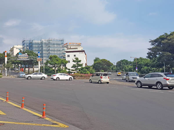 지난 22일 서귀포시 외돌개 입구 사거리 태평로에서 서문로터리 방면 도로를 확인한 결과 도로 1개가 3가닥으로 퍼져나가는 기이한 형태의 도로 구조를 갖고 있었다.