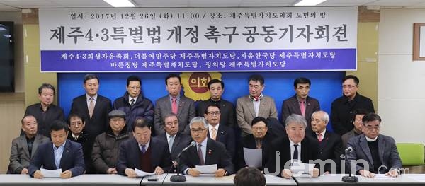 유족회와 더불어민주당·자유한국당·바른정당·정의당 제주도당은 26일 도의회 도민의방에서 기자회견을 열고 4·3특별법 개정안 통과를 위한 정부와 정치권의 대승적 협력을 강조했다.