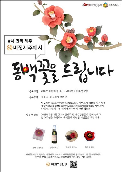 각 사이트의 당첨자 100명씩 총 200명에게는 수제 동백비누, 현무암 동백꽃 밀랍초, 제주동백 오일, 4.3 70주년 기념 철제 동백꽃 배지가 제공된다. 당첨자는 5월3일 비짓제주와 제주관광공사 공식 블로그를 통해 발표된다. 문의=제주관광공사 관광산업처(740-6928).