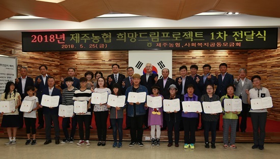 농협제주지역본부(본부장 고병기)는 26일 지역본부 대회의실에서 제주농협 및 사회복지시설 관계자, 읍면동 사회복지 담당자 등 50여명이 참석한 가운데 '제주농협 희망드림 프로젝트'지원사업 1차 전달식을 가졌다.