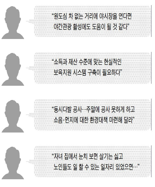 환경문제에 대한 불만도 쏟아냈다. 한 유권자는 "최근 집 일대에 각종 공사가 동시다발적으로 진행되면서 주말에도 아침부터 이어지는 공사 소음에 잠에서 깨고 먼지 때문에 창문을 열지 못하는 등 불편을 겪고 있다"며 "최소한 주말에 공사를 하지 못하게 하고 소음·먼지에 대한 환경대책을 마련해달라"고 요구했다.