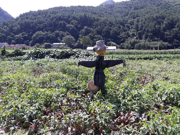 산 아래 나물 밭에 허수아비가 서 있다. 자세히 보니 이빨 빠진 허수아비다. 새들도 보이지 않는다. 딱히 지킬 것도 없는 산나물 밭이다. 새를 쫓기 위해서 허수아비가 서 있다는 말은 옛말이다. 요즘 허수아비는 오가는 이들의 눈요깃거리이다. 그래서 패셔니스트 허수아비가 많다. 벙거지 모자에 롱티셔츠, 허리춤에는 소고도 매달았다. 발 아래는 곰취나물, 곤드래, 수리취, 오가피나무도 보인다. 제주의 지슬이 어려운 시절 구황식물이었다면 강원도의 구황식물은 이런 것들이었으리라.
