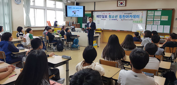 제민일보사(대표이사 사장 김영진)와 제주특별자치도가 공동 주최하는 '2018 찾아가는 청소년 칭찬아카데미'가 4일 한라초등학교(교장 강시남) 6학년 4반 교실에서 열렸다. 이날 아카데미에서 송삼석 국가인권위원회 인권강사는 칭찬의 힘을 설명한 뒤 칭찬 십계명과 칭찬할 때 쓰면 좋은 말을 소개하며 생활 속에서 실천하는 방법을 안내했다.