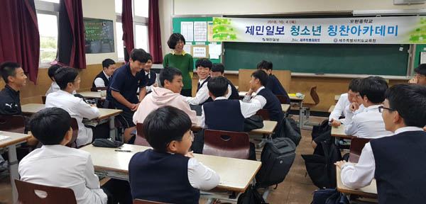 제민일보사(대표이사 사장 김영진)와 제주특별자치도가 공동 주최하는 '2018 찾아가는 청소년 칭찬아카데미'가 4일 오현중학교(교장 고우현) 1학년 5반 학생들을 대상으로 열렸다. 이날 칭찬아카데미에서 강사로 나선 홍리리 전 제주여성인권연대 대표는 질풍노도의 시기인 중학생들에게 남을 인정해주는 것은 인간의 존재감을 드높여주는 최고의 방법이며, 칭찬을 통해 누구나 행동으로 옮길 수 있다는 점을 강조했다.