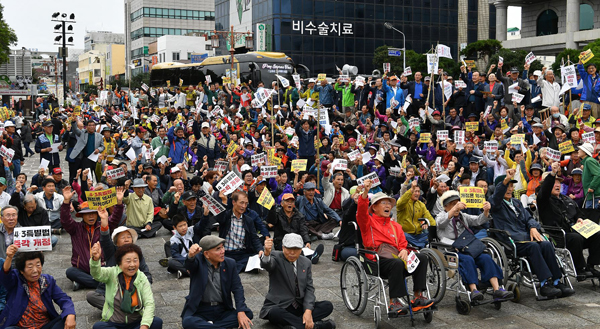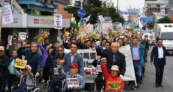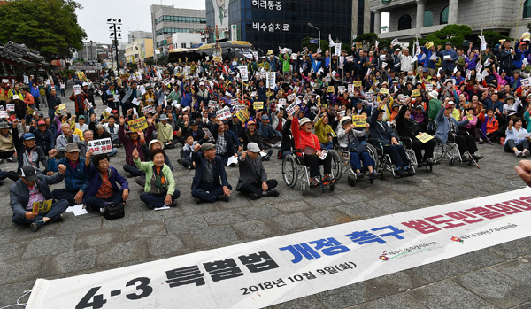 휠체어를 탄 4·3 휴유장애인협회 회원들이 선두로 나선 시가행진에는 '4·3특별법 개정은 역사의 외침이다' '국회는 4·3특별법 즉각 개정하라' 등이 적힌 피켓을 든 1000여명의 4·3 생존희생자와 유가족들이 참여해 목소리를 높였다.