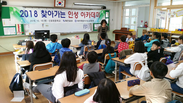 제민일보사(대표이사 사장 김영진)가 제주특별자치도교육청과 공동 주최한 '2018 찾아가는 인성아카데미'가 18일 신광초등학교(교장 장지순) 4학년 5반 교실에서 학생들을 대상으로 열렸다. 이날 인성아카데미에서 강사로 나선 홍리리 전 제주여성인권연대 대표는 10대 초반을 시작하는 4학년 학생들에게 다함께 살아가기 위한 바른 인성을 가꿔나가기 위한 실천들을 소개했다.
