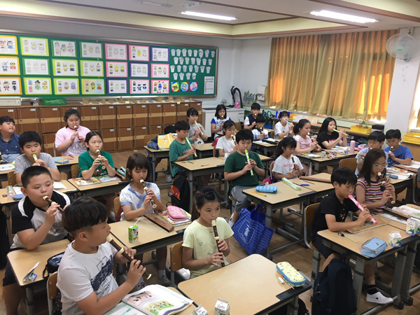 학년별로 공통된 악기를 정해 1인 1악기를 운영하고 음악시간을 활용해 악기 연주시간도 진행하고 있다.