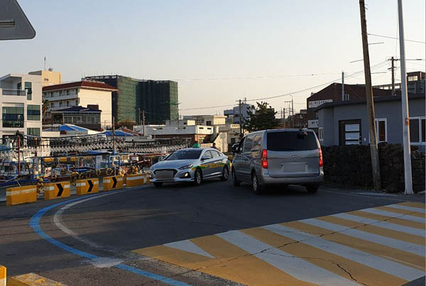 지난 29일 오후 함덕포구 앞 현장을 방문해보니, 도로 폭이 왕복 2차선 도로에서 이면도로로 좁아지면서 차량이 주행 중 급정거하는 모습들이 자주 목격됐다.